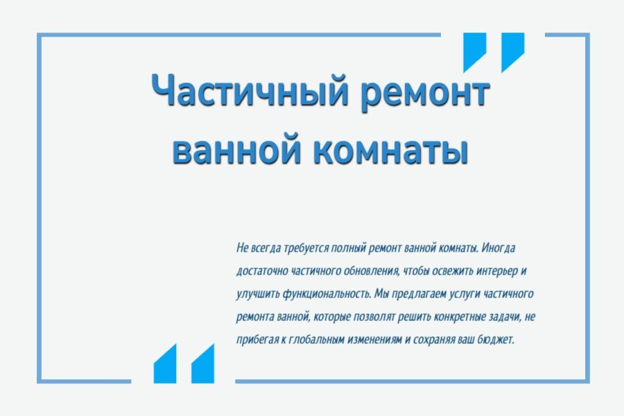 Частичный ремонт — это выполнение отдельных работ, которые необходимы для улучшения состояния ванной комнаты. Вот основные виды работ, которые могут быть выполнены в рамках частичного ремонта: